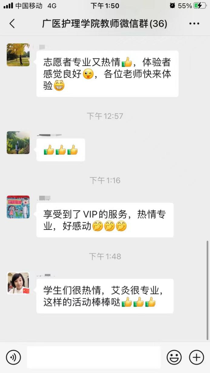 本科生为主,活动内容是为老师提供护理学专业课《中医护理学》的中医理疗服务,包括艾灸、耳穴压豆、按摩理疗等。活动现场轻松愉悦,学生志愿者边为老师理疗,边与老师们聊天,传达中医艾灸和耳穴压豆的益处和作用机理,还为个别老师们提供了针对性的按摩理疗。活动得到老师们的一致认可和高度评价!