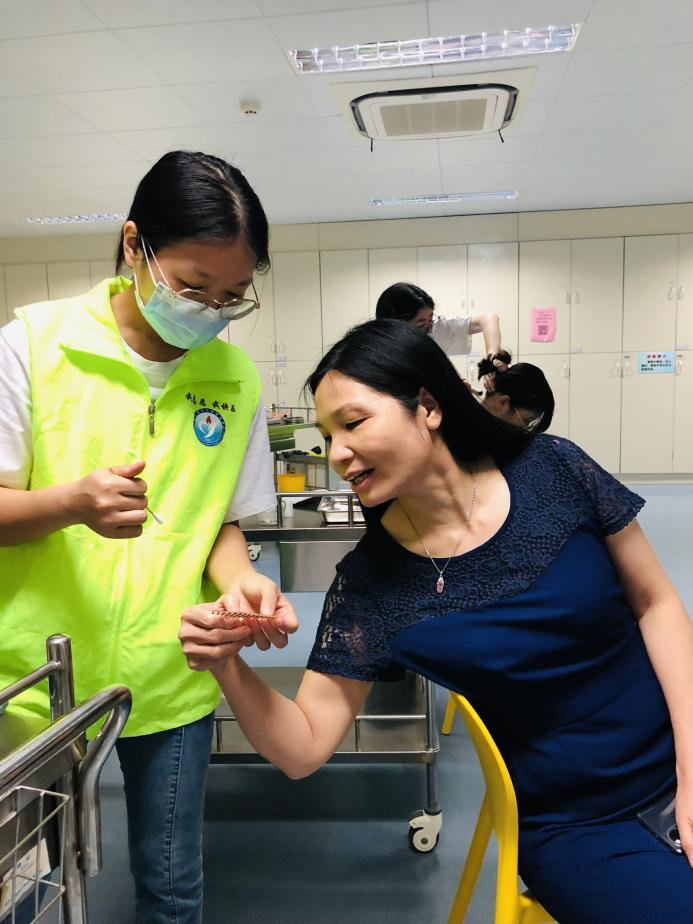 党总支雷丽琼书记听取学生讲解耳穴压豆的知识