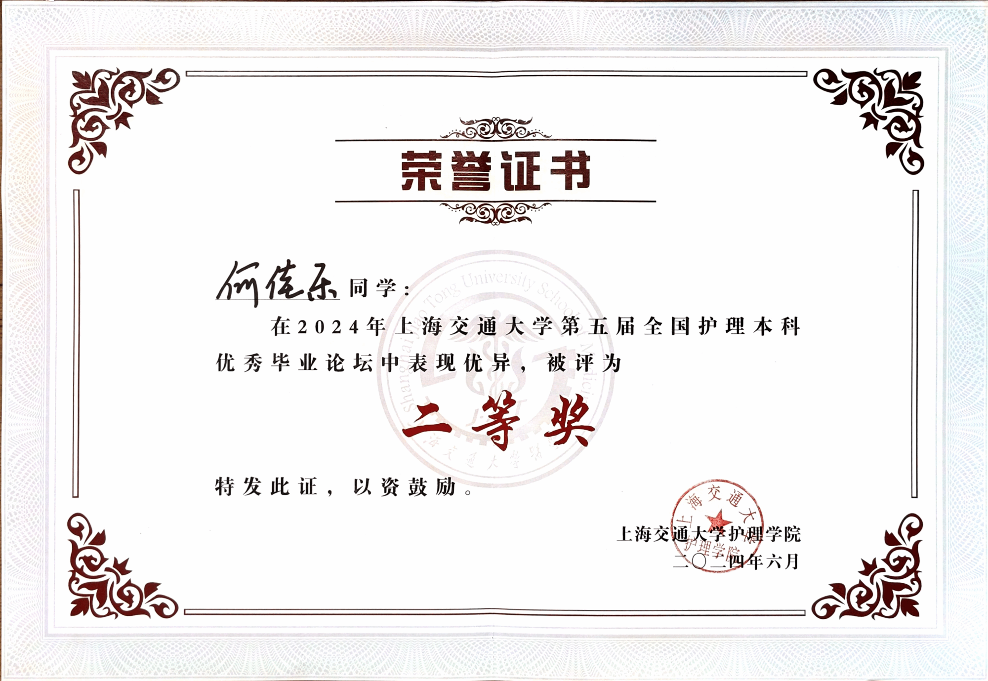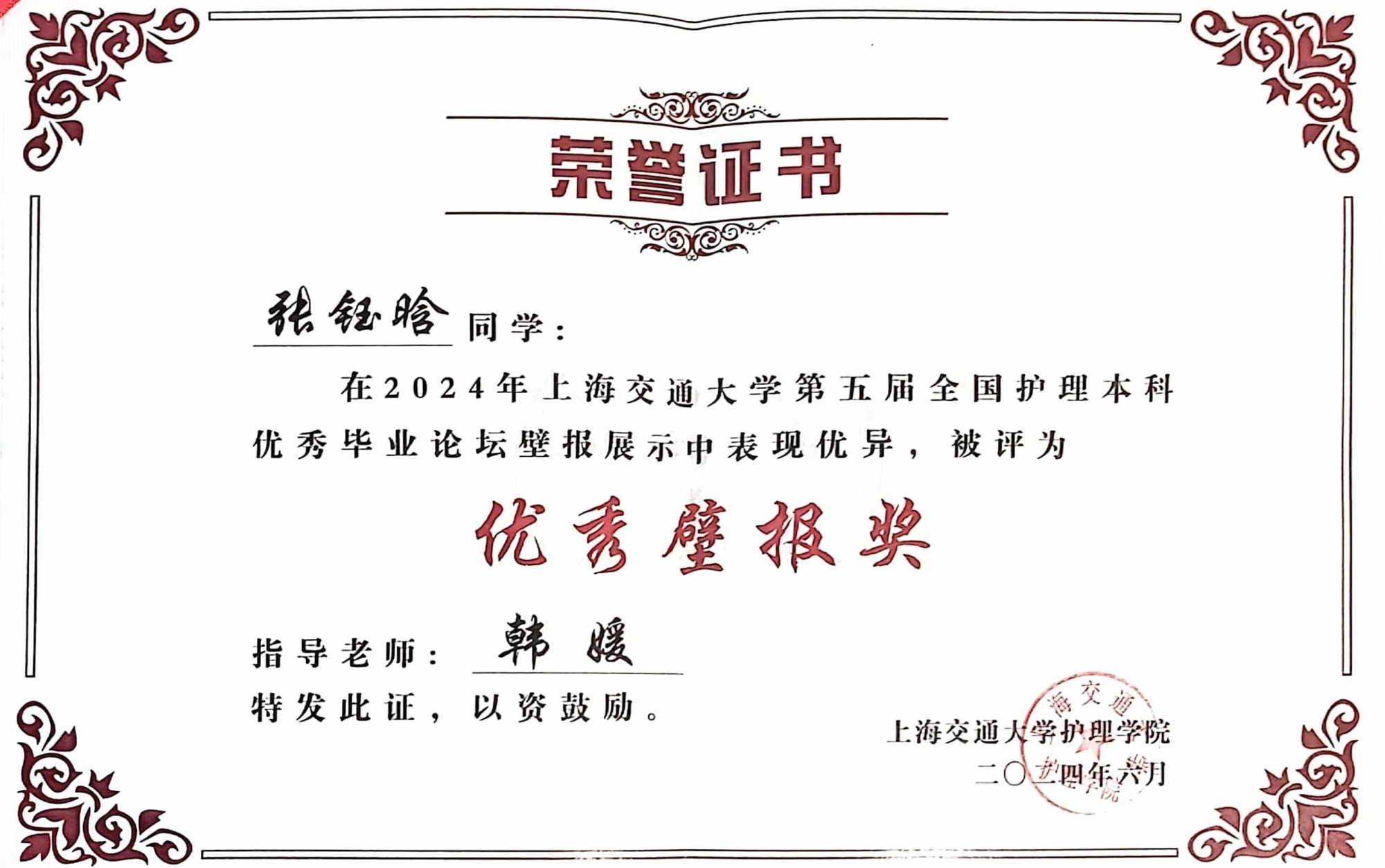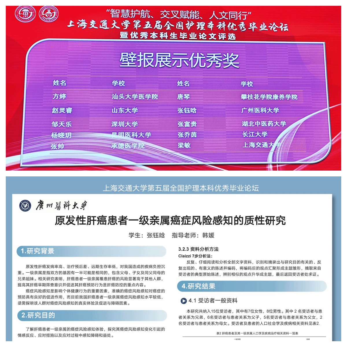 2020级护理本科生何佳乐的毕业论文《人际关系对青少年心境障碍住院患者非自杀性自伤的影响》(指导教师:高云副教授)荣获口头汇报二等奖;2020级护理本科生张钰晗的毕业论文《原发性肝癌患者一级亲属癌症风险感知的质性研究》(指导教师:韩媛副教授)荣获优秀壁报奖。