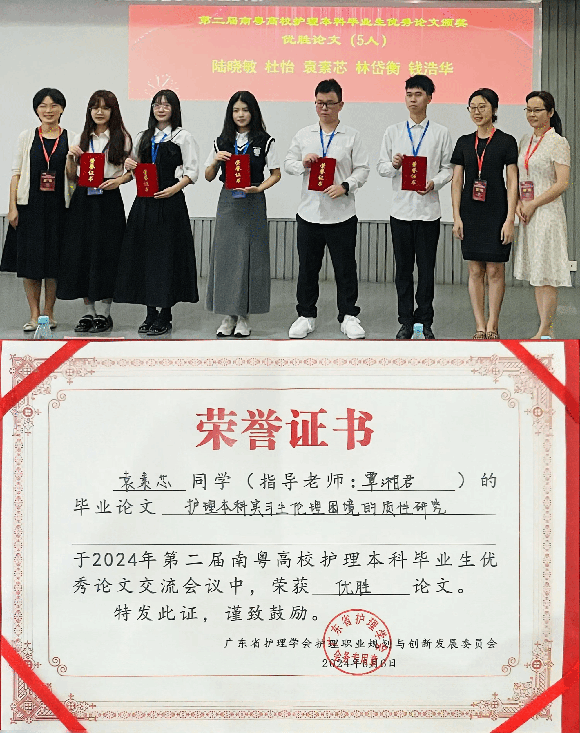 袁素芯同学获第二届南粤高校护理本科毕业生优秀论文优胜奖(左四)