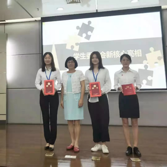 欧丽娅主任为学生委员颁发聘书,柯春洁担任委员长,朱柯宇、胡敏担任委员。