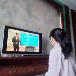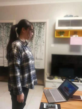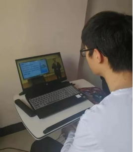 的学子们在家中参加网上升旗仪式。同学们怀着满满的自豪感和爱国主义情怀向视频中的国旗肃立致敬。