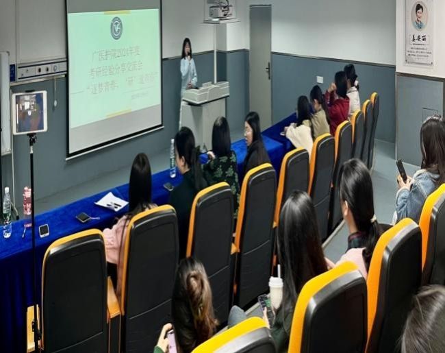 应同学们要求,会议采用“线上+线下”相结合的形式展开。本次交流会由学生办主任欧丽娅教授策划指导,护院本科优秀毕业生2022届高梦昕(在读广医护理研二)、2023届赖美琦(在读广医护理研一)应邀分享,参会的有学院各个年级同学约200人。