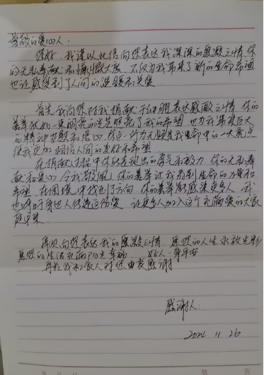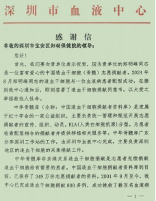 2024年12月25日,郑明峰顺利完成造血干细胞捐献的整个过程。这个看似普通的冬日,对郑明峰来说却是意义非凡,于此同时郑明峰收到了捐献造血干细胞荣誉证书以及患者的感谢信。