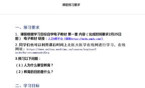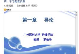 e平台,学习由罗艳华教授录制的《护理教育学》第一章导论视频、李桃副教授录制的《护理教育学》第二章护理教育的目标体系、第四章护理教育的课程的视频。要求学生通过以上学习能够基本熟悉各章节的内容并进行自主预习效果测验,同时记录自主学习过程中存在的问题。
