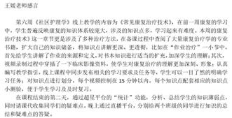 本课程按照知识点进行授课,为了增强学生知识架构的完整性,在每章节教学的最后,开设一次30分钟的直播课,师生面对面交流,学生可以对本章节的内容提问,老师实时解答。老师们按学生的需求确定直播课时间。直播前,老师要收集学生的问题、提炼直播内容,精心备课,保证了直播课的教学质量。学生们不仅巩固了知识,而且感受到老师的付出,师生之间的距离缩短了,学生体验到曾经在课堂中回荡着的轻松愉快的学习气氛。第六周王媛老师、程蕾老师分别就康复治疗技术、康复护理技术开展了直播答疑。(见图1-1、图1-2)