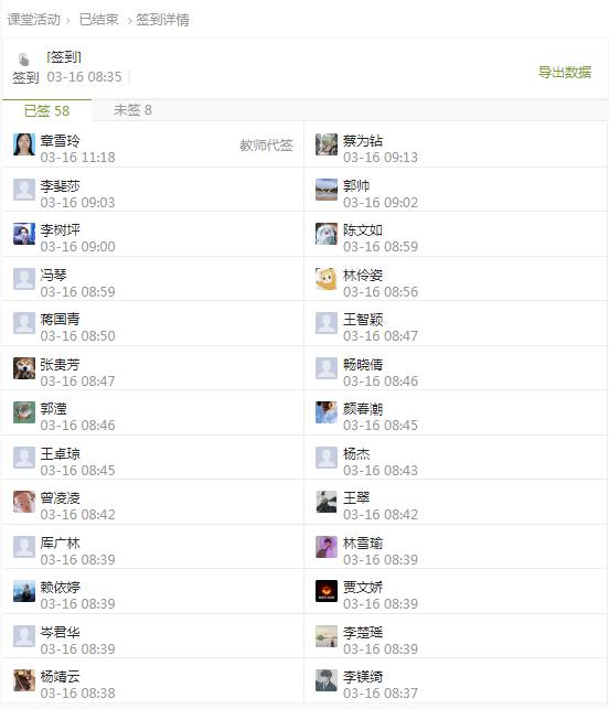 其次,积极做好课前通知,课中签到,课后答疑等课程进展管理工作。课前在线通知常态化,在线签到提醒温馨化,在线师生互动活跃化,减轻学生负担,促进学习进程,体现一切以学生为中心教学理念。