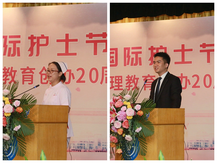 在优秀校友代表发言环节,首届护理学本科专业毕业生、副主任护师范薇回顾了她个人成长经历,介绍了自己如何成为一名优秀的护士,并对母校的悉心培养表达了感恩之情。2013届护理学专业本科毕业生、主管护师唐秋碧分享了难忘的大学学习岁月和从事临床护理工作的经历,勉励师弟师妹们珍惜时光,刻苦学习,努力提升综合素质。