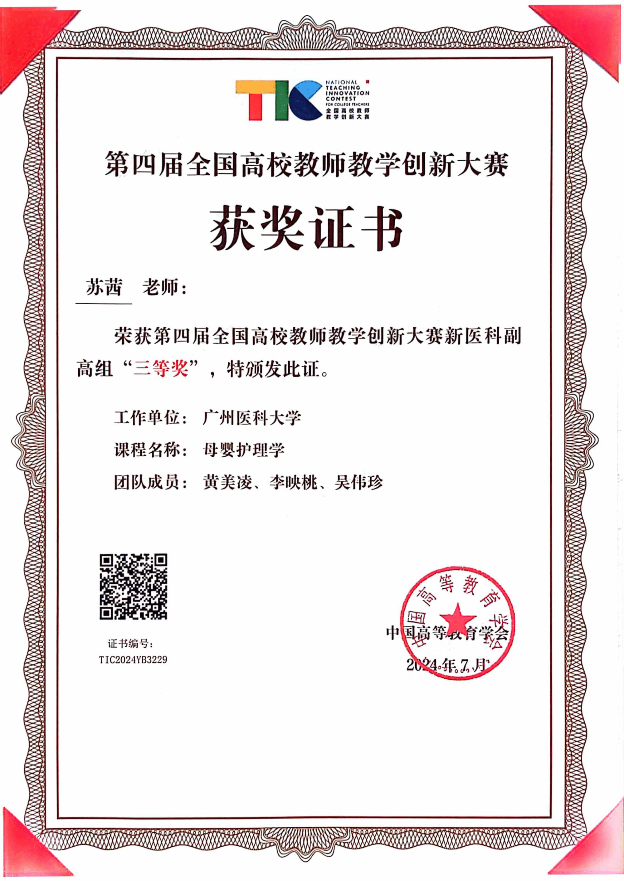 苏茜副教授代表《母婴护理学》课程团队(黄美凌、李映桃、吴伟珍)荣获新医科副高组三等奖。这是继2022年番号鸽