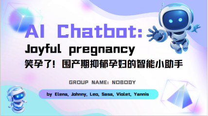 同学共同组成的“Nobody小组”,在跨地域协作中碰撞出思维火花。团队聚焦“围产期抑郁产妇”群体,设计了名为“Joyful pregnancy/笑孕了”的AI Chatbot。该智能助手设计颇具巧思:既能提供涵盖饮食调理、适宜运动、心理疏导等个性化方案,还能贴心设置提醒闹钟督促产妇坚持干预;加入的长效评估机制可动态追踪效果,确保干预的持续性。从功能框架搭建到细节打磨,每一步都凝聚着团队智慧:有人负责调研数据,有人优化交互逻辑,广医学子作为核心功能的设计者与汇报者,始终致力于让解决方案更贴合产妇需求。