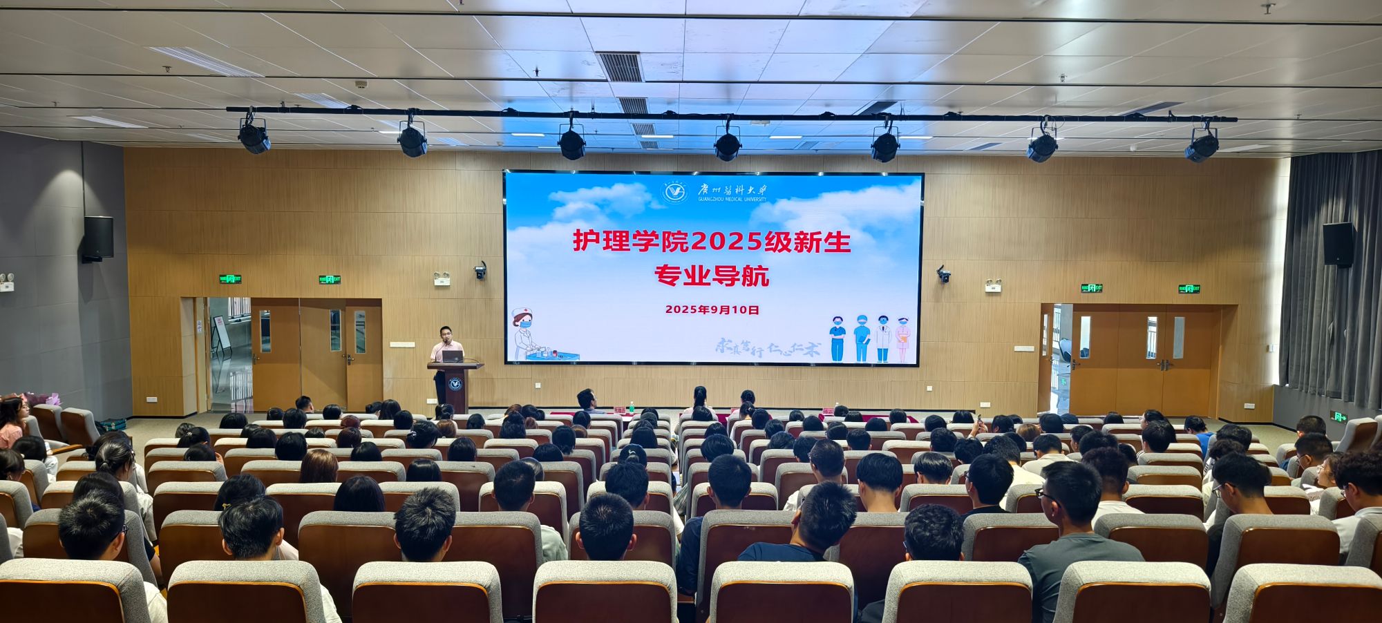 于2025年9月10日在番禺校区学术交流中心302会议室举行新生专业导航活动。学院领导廖晓艳院长、唐敏仪副书记,教师代表叶增杰教授、陈云主任护师,辅导员、兼职班主任及2025级全体护理学本科专业新生参加此次活动。
