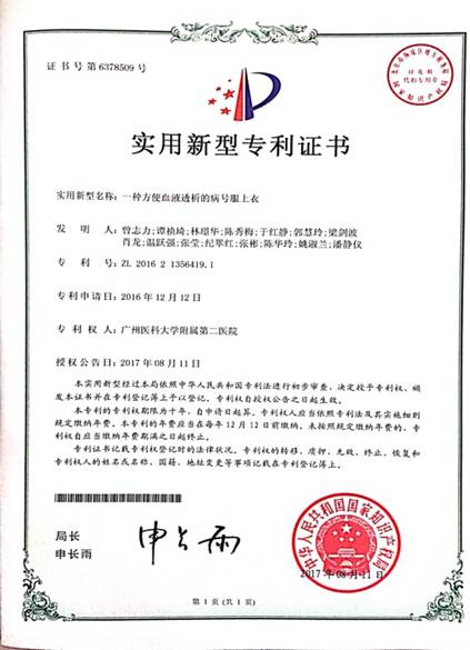 2017至2020,奋发破尘,4年间他分别提交了《一种血透内瘘训练装置》、《一种血液透析监测护理装置》、《一种血液透析故障检测报警装置》、《一种血透机吸管自动清洗装置》,《一种优化型血透护理床》,、《一种血透辅助治疗仪》,国家发明、《一种血透用分流外接装置》6项发明专利申请。