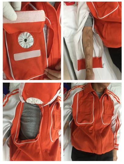 2015年初,完成一年多的规范化培训学习,重新回到血透中心工作。他发现广大的血液透析患者在治疗过程中有两个治疗细节值得反思:一、动静脉内瘘的血透患者,秋冬季节穿的衣服较多,需要挽起衣袖才能充分暴露肢体以达到足够穿刺部位,而几件衣服衣袖卷起时会使得袖口的内孔径变小,形成一个有一定弹性“衣袖环”套扎内瘘手的上臂部,这就影响了血液回流,导致患者透析充分性下降,直接影响透析治疗质量。二是,留置颈内中心静脉导管患者。为在开管护理操作达到无菌操作要求,需充分暴露治疗置管处的身体区域,绝大多时候需裸露患者上身胸前一大部分躯体,很大程度上暴露了患者的隐私,尤其会给女性患者造成较大的心理影响。同时,亦不利于患者保暖,而引起感冒增加感染的危险。有鉴于此,他设计了一种更加人性化合理化的方便血液透析的病号服上衣(见图11-14)。首先,他在衣服的胸部设置开片,当解开连接件时,前胸部位的开片可以掀起来,达到暴露血透患者颈内身静脉置管的治疗区域,方便血透深静脉导管开管、封管护理操作,同时能较好的解决了暴露隐私和保暖的问题。