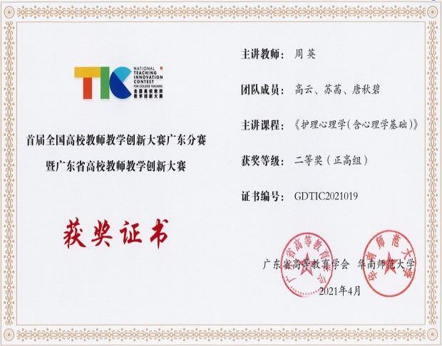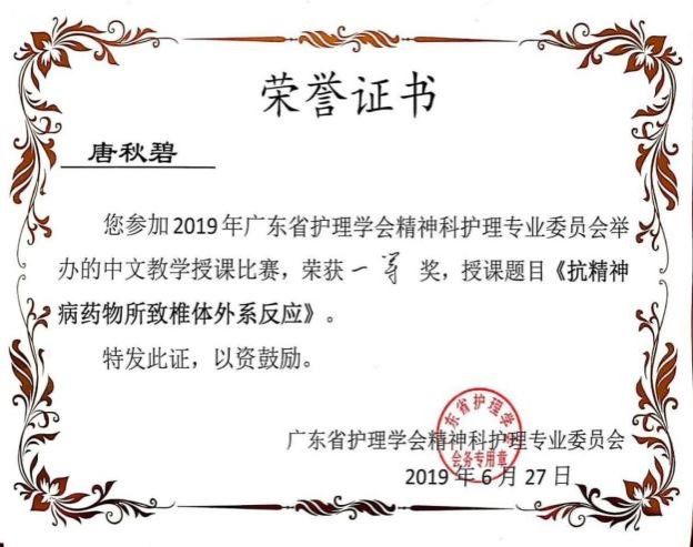 附属脑科医院“正念认知疗法培训与实践基地”,在临床率先为精神障碍患者开展正念疗法,同时每年均对省内外的同行进行正念疗法的相关培训,从2016年至今共培训学员将近两千人次。曾代表广州市卫健委参加广州“不忘初心,牢记使命”微党团课比赛荣获三等奖,参加首届全国高校教师教学创新大赛广东分赛暨广东省高校教师教学创新大赛获二等奖,参加广东省护理学会精神科护理专业委员会中文教学授课大赛获一等奖等。