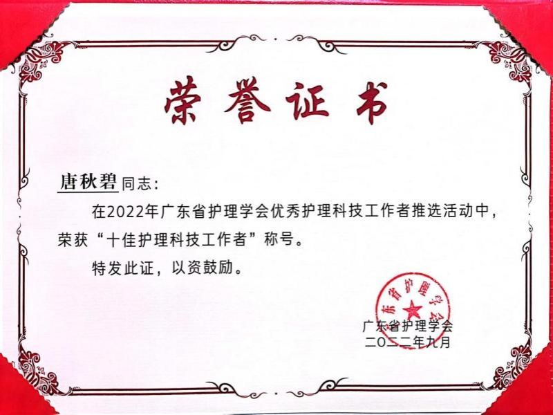 科研创新方面,唐秋碧善于从临床寻找灵感,将科研成果应用于临床,造福患者。先后主持市级课题有三项,以前三作者参与国家省部级课题多项,发表学术论文30多篇,其中SCI收录5篇,获得国家实用新型专利有4项。曾被荣获首届“岭南十佳护理科技工作者”称号,作为主要参与者荣获广东省护理学会第六届科学技术奖一等奖、广东省护理学会第五届科学技术奖二等奖,多次在广州市、广东省护理学会优秀论评比中获奖。