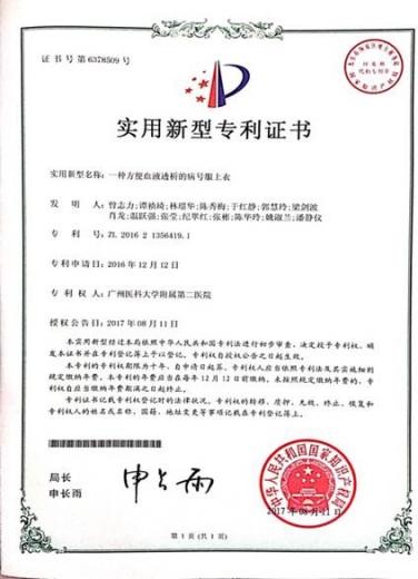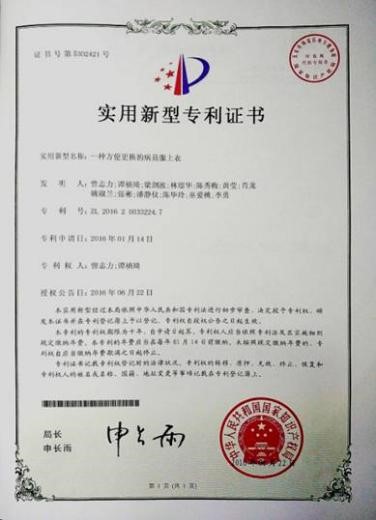 面对现有病号服卧床患者床上更衣护士耗体力、患者舒适度低、安全性差等一直困扰工作的问题,他另辟蹊径,设计了一款的采用侧开襟设计的病号服——《一种方便卧床病人更换的病员服上衣》(见图3),这就解决了护士在为卧床患者更换衣服过程中,避免短时间内对病人的频繁翻动身体而产生的痛苦;减少了病人的换衣时间,大大提升了工作效率;也可以减少患者的翻动次数,降低了护士更衣时的劳动强度,节省了体力,对长期从事这一操作的护士职业安全有保障。