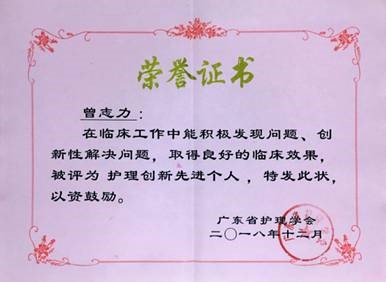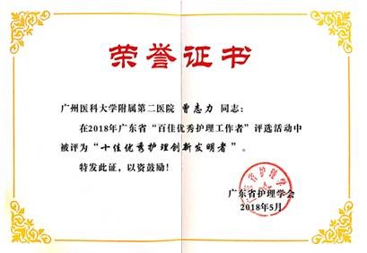 摹然回首,已在血透护理之路行十余载。近年来以第一、通讯作者发表论文10篇;主持省级课题2项,市级课题4项,广东省适宜技术立项1项;获得国家发明专利2项,国家实用新型专利4项;参编高等教育教材2部,参编著作1部。先后获得省、市级创新类奖项23项,先后被评为广州市优秀护士、广州市青年岗位能手、广东省护理学会“优秀创新先进个人”、广东省“十佳护理创新发明者”等称号(见图5)。