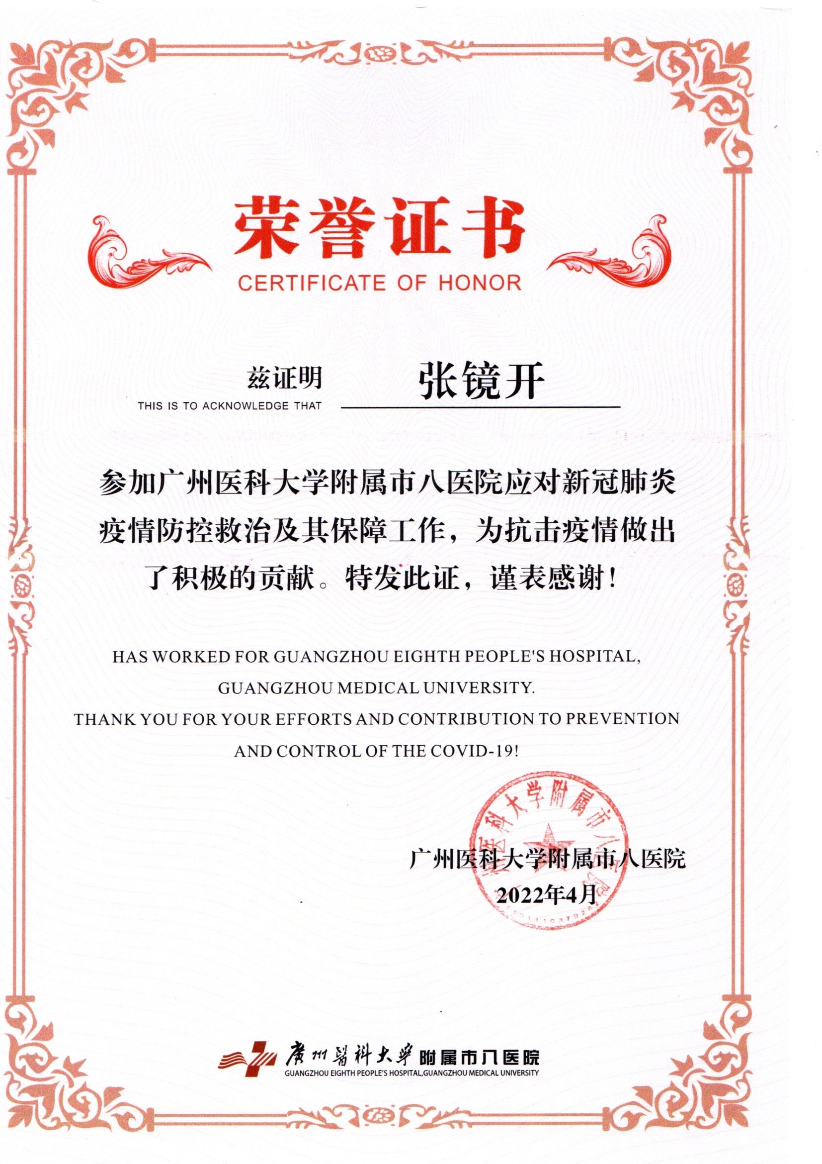 附属第一医院的进修学习,张镜开已熟练掌握了各种抢救与配合的知识与技能,如高质量CPR、气管插管、电除颤、机洗胃、体外起搏、呼吸机使用、ECMO使用及配合等,也对临床工作的良好运行有深刻体会,协助制定急诊分诊标准,胸痛、卒中中心工作指引等,良好的工作效果得到了组织的认可。他曾2008年奔赴汶川当地完成“抗震救灾”医疗支援工作,获得“广州市抗震救灾先进个人称号”;完成2010年第16届亚运会及亚残会等多次医疗保障工作;担任多次如横渡珠江,广马,广交会等医疗保障,均出色完成任务。疫情期间,他坚守第一线,奔赴广州市第八人民医院肩负负压转运工作,出色完成任务。他时刻保持对生命的敬畏之心,为有效救治患者竭尽全力,获得医德医风优秀个人称号;他对科室建设尽心尽力,从分诊信息系统的建设,抢救与配合流程的建立与改善,疫情期间各种指引、流程的制定、落实于质控都渗透着他的努力。2018年张镜开任急诊分诊抢救区护士长,期间工作认真负责,兢兢业业,履行护士长的职责,配合科室推广新技术与进行培训工作。他带领护理团队紧跟科室步伐大力发展起在周边影响较大的较新的急诊分诊信息系统,也更好的贯彻国家“急诊患者分级分区,按病情处置”的宗旨。带领护理团队从对ECMO(体外膜肺氧合)的一无所知到能独立开展,工作效果得到了肯定。进行“创新型冰帽”QCC项目,这个项目获得了医院的QC项目二等奖以及第二届省护理用品创新大赛三等奖。从2008年开始,他开始负责临床带教工作,含省级、市级专科护士,进修,轮科,实习,见习,学院在校学生等各层次护理人员进行带教和授课,教学效果得到了各方的肯定,期间制作人卫慕课及参与授课比赛并获奖。出色的工作得到了肯定,张镜开曾获国家级的急诊医疗改善奖,广州市优秀护士称号、2次获得病区护理质量奖,3次获得医院优秀护士称号。