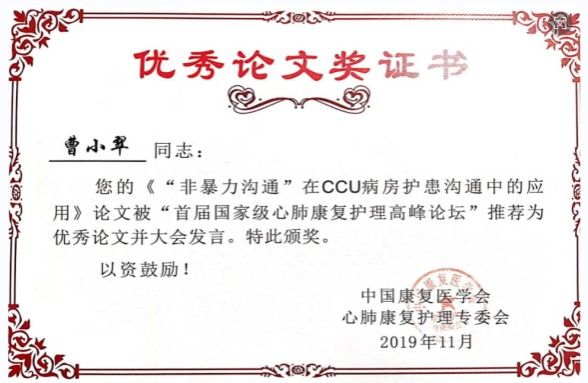 自参加工作以来,她铭记“厚德修身,博学致远”校训,在临床工作中砥砺前行,脚踏实地,乐于奉献,潜心钻研。本着“把工作做得更好”的目标。在23年的心血管内科护理工作中,爱岗、敬业,勇于担当,用实际行动践行社会主义核心价值观。敬佑生命、救死扶伤,也兼顾疾病的预防和康复,推动和发展心血管疾病预防与康复护理、心血管慢病管理、互联网+护理及远程医疗护理体系事业,在心脏康复护理领域走出“专科道路”。