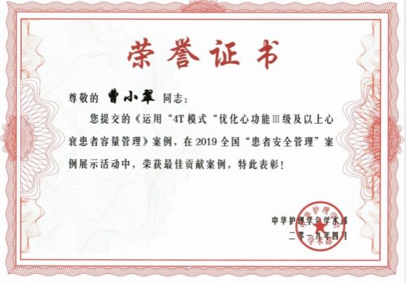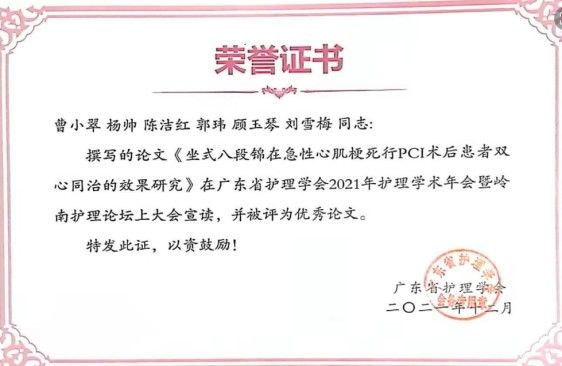 业技术精湛,强化专科护理服务能力。她自2019年7月参加心肺康复专科护士培训回后积极开展心脏康复护理技术,改善心脏病患者预后。中国心血管病危险因素流行趋势明显,导致心血管病的发病人数持续增加,为了改善心血管患者的预后,从心脏康复体系建设、人才培养、团队建设等多个角度出发,加强心脏康复中心的硬件建设和心脏康复中心软实力提升。按照心脏康复流程,从功能评估、康复运动、康复教育、辨证膳食、心理康复等方面实施系统化康复措施。通过心肺运动试验、运动平板等多种现代化的仪器设备为心血管病患者进行功能评估,制定个体化的运动处方。使用弹力带、哑铃、跑台、踏车等进行多种有氧及阻抗运动的同时,将八段锦、耳穴压豆、话疗传统中医治疗方法融入其中,为患者进行心理、戒烟等指导,为心血管疾病患者提供专业、科学、有效、个体化的康复方案。为心血管危重症住院患者及时心脏康复,促进患者心功能恢复,日常生活能力及运动能力恢复,免床带来的不利影响,并进一步提高治疗效果,缩短住院时间。构建并落实专科护理质量指标“急性心肌梗死PCI术后Ⅰ期心脏康复五大处方落实率”,提高康复护理服务的规范化和标准化,促进护理质量持续改进,为临床护理管理和心脏康复质量评价与监测提供依据。积极鼓励心血管患者门诊康复,心脏康复完整评估病例5个时间点(初始基线评估、每次运动治疗前评估、针对新发或异常体征/症状的紧急评估、心脏康复治疗周期中每 30 天再评估以及结局评估)评估达100%。门诊心脏康复次数≥24次/人达77%(文献报道18.75%)。有效改善心脏病患者心肺功能、活动耐力、生化指标、心理状态。心脏康复技术贯穿于整个心血管疾病的预防和治疗,是无创心脏病学治疗的核心。近4年累计通过心脏康复护理技术服务人次达7000多人次。成功创建全国心血管疾病管理能力评估与提升工程国家标准化心脏康复中心,苏州工业园区心血管健康研究院国家级心脏康复中心。创建心脏康复俱乐部为心脏支架手术术后患者搭建的医护患互动、沟通、学习和交流的平台,积极应用医学知识进行宣传教育,给予患者关心、支持、使患者能发挥其潜能。成立广东省首家医院PCI术后II期心脏康复护理专科护理门诊。通过互联网+的管理形式将医院传统心脏康复模式逐渐转变为家庭心脏康复模式,让患者获得一系列完整的心脏健康服务,保持连续性医疗服务。促进心血管疾病患者从治疗到康复的全程闭环管理,改善心脏病患者的预后。以病人为核心,团队为基础,积极组织心脏康复为主题系列活动。于2019年荣获全国“患者安全管理”案例展示活动中,最佳贡献案例;2020年南方最有影响力健康科普作品三等奖、健康科普作品奖三等奖;2020年《提高PCI术后患者Ⅰ期心脏康复落实率》荣获广东省医院品管圈比赛一等奖;2021年从心康复-基于IMB模型的“互联网+”延续护理模式在AMI行PCI术后患者的应用获广州市“互联网+护理服务”亮点展示大赛一等奖;2023年第八季改善医疗服务行动全国医院擂台赛中南赛区杰出案例奖。