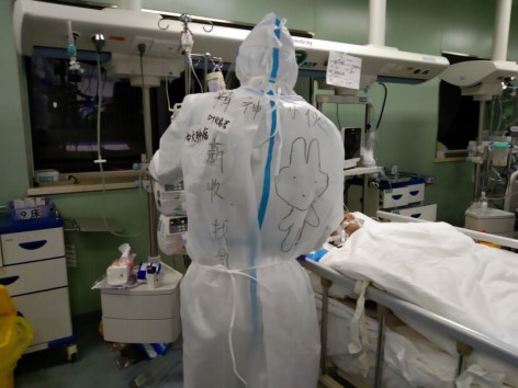 为了缓解我们上班的压力,这几天上班前几个心灵手巧的“战友”总会在我们的防护服上画上点画、写上点东西,互相鼓励!前天上班前就通知说要收病人,于是就有了这图“精神小伙,新收找我”,哈哈,真是谢谢战友们对我的厚爱和器重啊,把新收患者这种重任交给我!