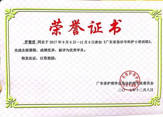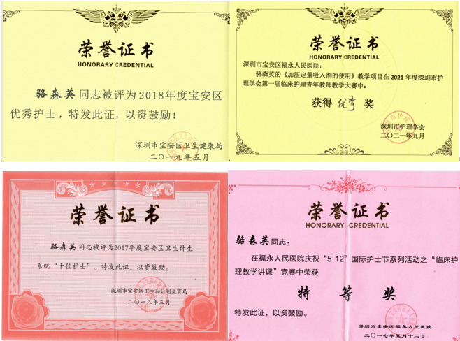 2019年担任护士长后,带领团队先后获得“深圳市巾帼文明岗”“宝安区三八红旗集体”荣誉称号。曾获宝安区卫生计生系统“十佳护士”、宝安区优秀护士;在宝安区福永人民医院临床护理教学讲课竞赛中获特等奖,在深圳市护理学会第一届临床护理青年教师教学大赛中获优秀奖。主持参与区级课题4项,获实用新型专利1项。